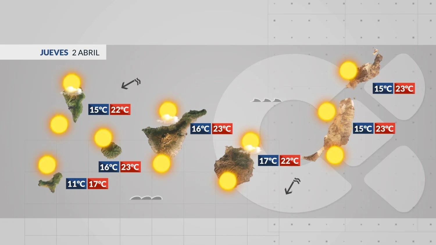 Sonnenreiche Stunden bestimmen das Bild. Lediglich im Norden und in der Hauptstadt Las Palmas können sich unterhalb von 600 Metern einige Wolken bilden. Die Temperaturen bleiben angenehm, viele Küstenorte knacken die 23-Grad-Marke. Ein mäßiger Nordostwind weht.