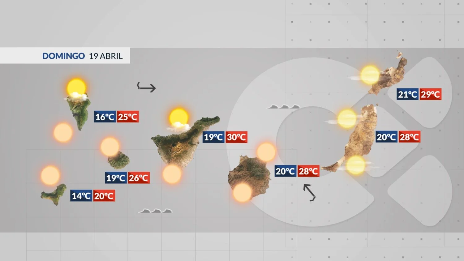 Bewölkung durch mittlere und hohe Wolken, vor allem im Süden und Südosten. Sonst überwiegend wolkenlos oder strahlend blauer Himmel. Calima betrifft vor allem die mittleren und hohen Lagen. Der Wind kommt aus Ost und dreht am Nachmittag und Abend auf West. Auf den Gipfeln sind sehr starke Böen wahrscheinlich. An den Küsten werden 24°C bis 34°C erwartet.