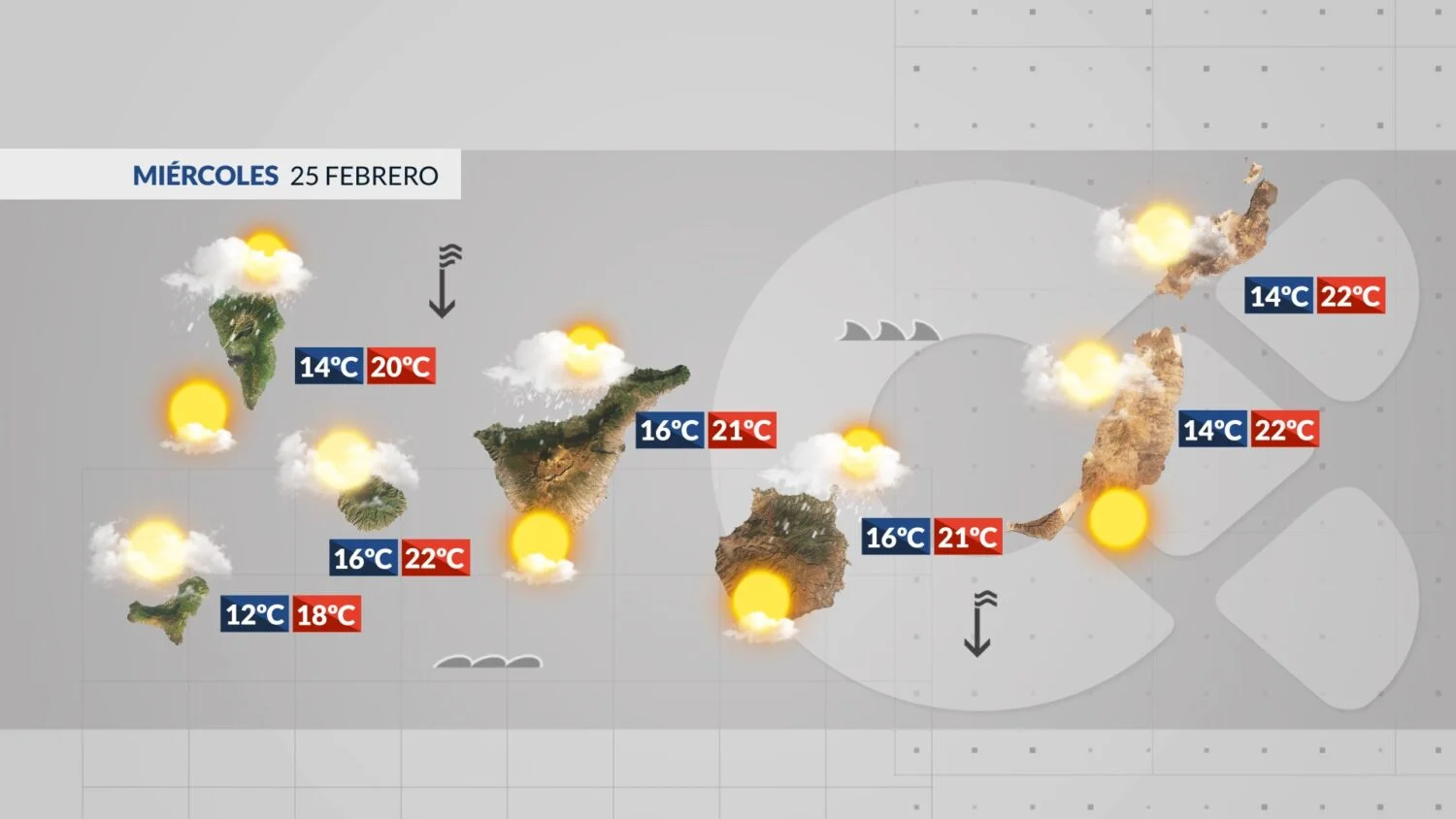 Die Temperaturen sinken moderat. In einigen Gebieten, vor allem in den mittleren Höhenlagen, werden Werte gemessen, die 8 bis 10 Grad unter denen vom Dienstag liegen. Der Wind intensiviert sich an den nordwestlichen und südöstlichen Spitzen sowie in den Gipfellagen der westlichen Inseln und Gran Canarias. Am Nachmittag könnten Böen 70 bis 80 km/h erreichen. Der Zustand des Atlantiks verschlechtert sich durch Dünung aus dem offenen Atlantik und Windsee. Wellen aus Nordrichtung könnten über 4 Meter Höhe erreichen, im Süden werden mehr als 2 Meter erwartet.