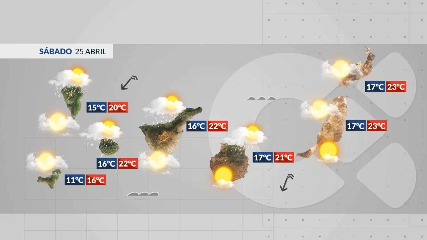 Im Norden und Osten liegt die typische „Panza de burro“ (Wolkendecke). Im Rest der Insel ist es überwiegend wolkenlos oder leicht bewölkt. Am Nachmittag bilden sich im Süden lokale Quellwolken, ohne dass mit Regen zu rechnen ist. Der Passat weht mäßig mit starken Böen an den Südost- und Nordwesthängen. Die Temperaturen in der Hauptstadt Las Palmas liegen zwischen 17 und 21 Grad.